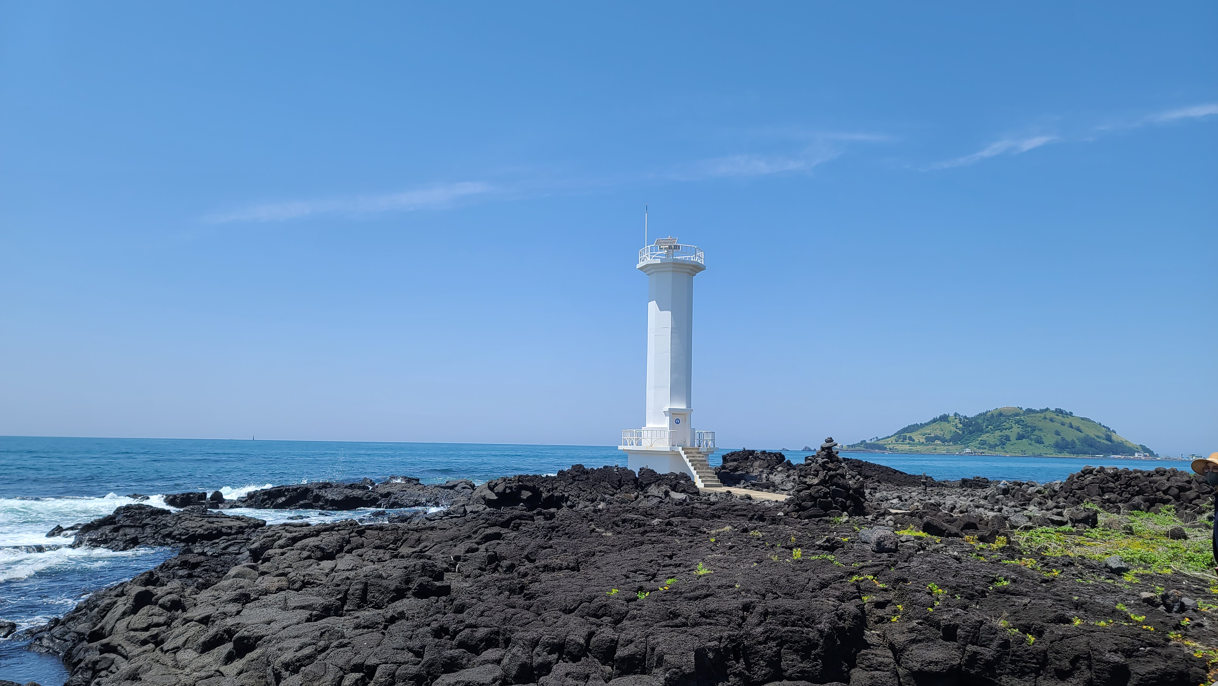 금능리 해안가 장석長石코지에 등대가 보이고 그 넘어로 비양도가